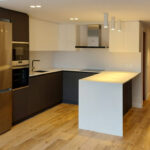 Esta cocina moderna ha estado diseñada en forma de U. Uno de los laterales ha sido pensado como zona de almacenaje, con cajones y armarios, y el otro lado es una barra donde sentarse y disfrutar. Los muebles se han seleccionado en color blanco y negro, así como el fregadero y el grifo que combinan el color negro y el inoxidable.