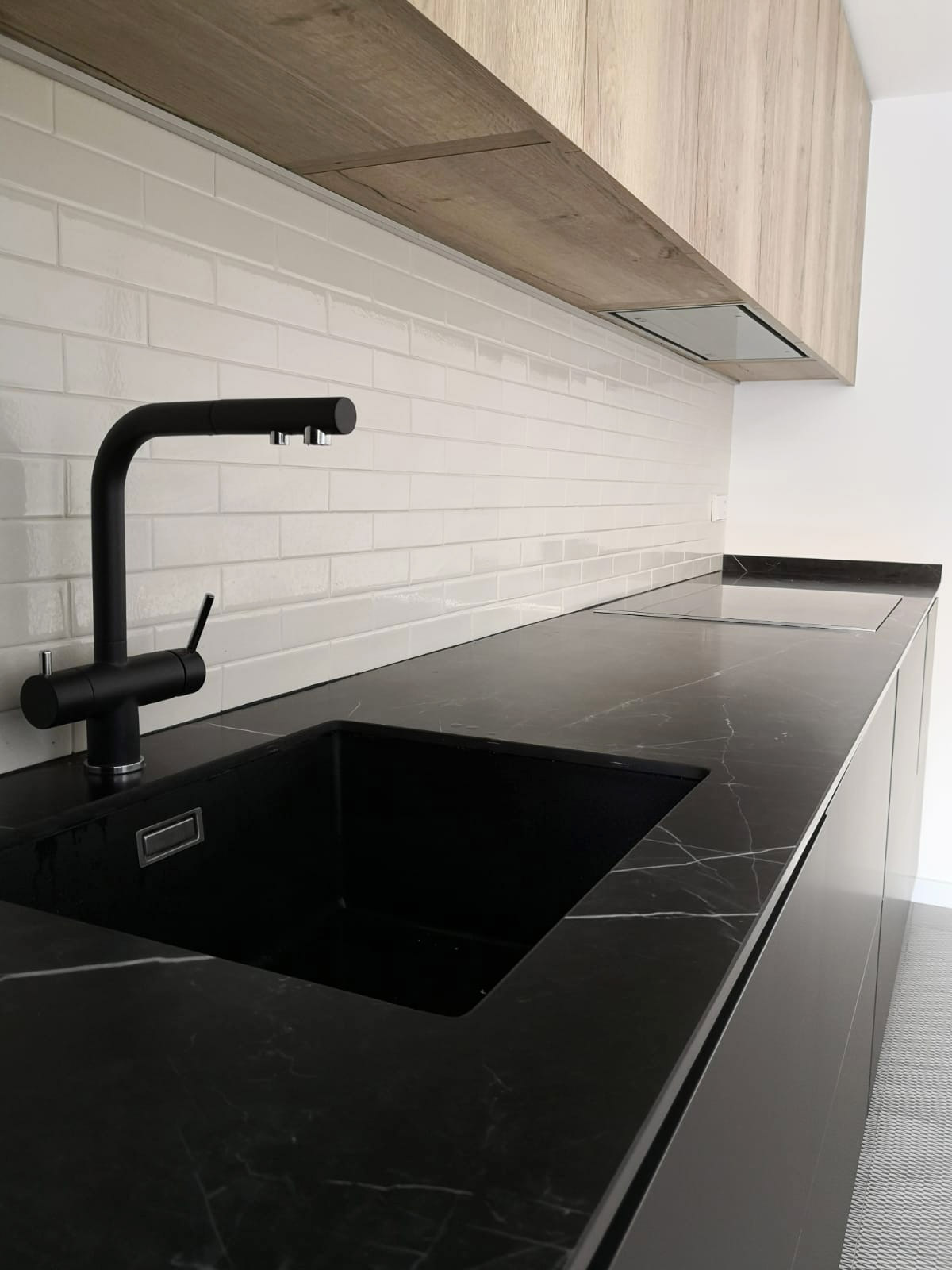 - Fregadero de resina y grifo de color negro.